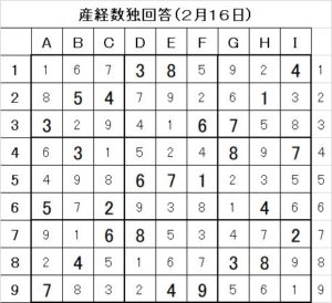 数独問題と回答(産経新聞2020年2月16日掲載分)