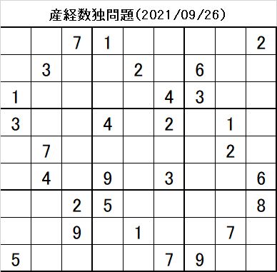 数独問題と回答(産経新聞2021年9月26日掲載分)