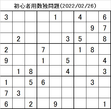 本日の初心者用数独問題は、以下の通りです。