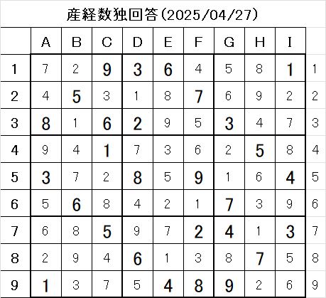 本日の数独問題に対する答え!!