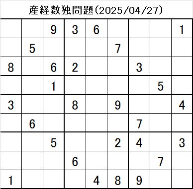 本日の数独問題は・・・