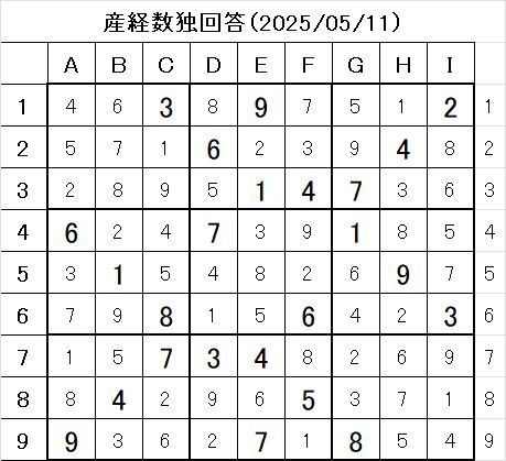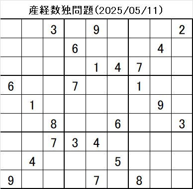数独問題と回答(産経新聞2025年5月11日掲載分)