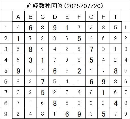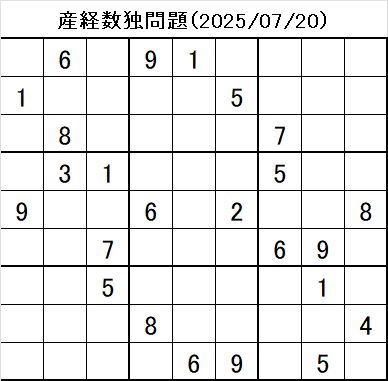 数独問題と回答(産経新聞2025年7月20日掲載分)