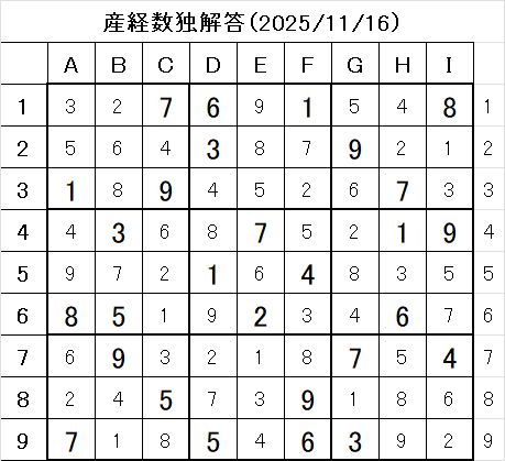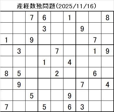 - 問題画像:産経新聞 数独 2025/11/16 問題