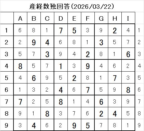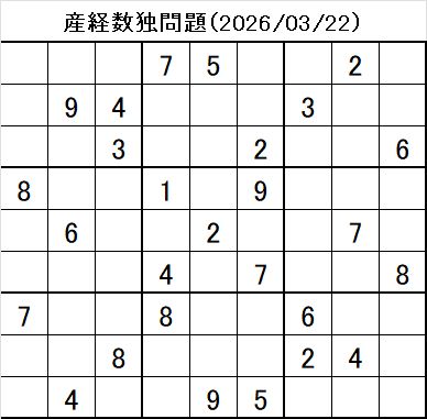 - 問題画像:産経新聞 数独 2026/3/22 問題